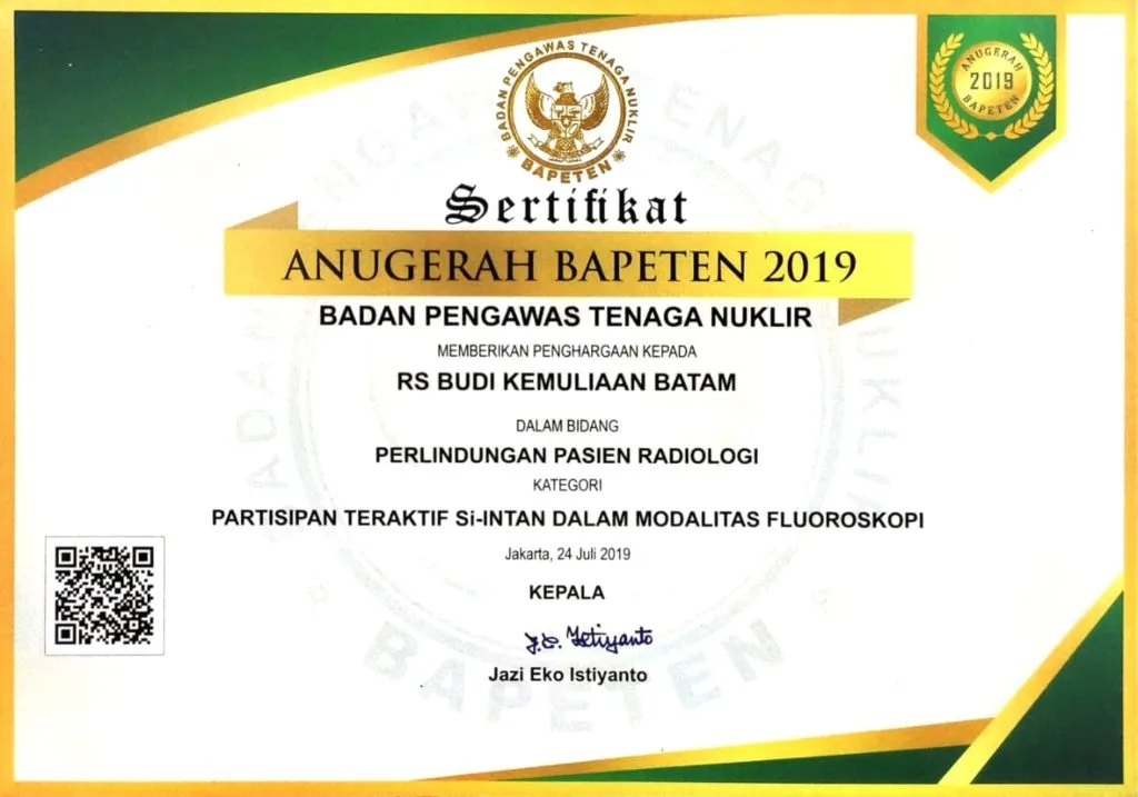 Penghargaan atas komitmen kami dalam menjamin keselamatan dan keamanan penggunaan tenaga nuklir pada fasilitas Radiologi, memastikan diagnosis yang akurat namun tetap aman bagi pasien.