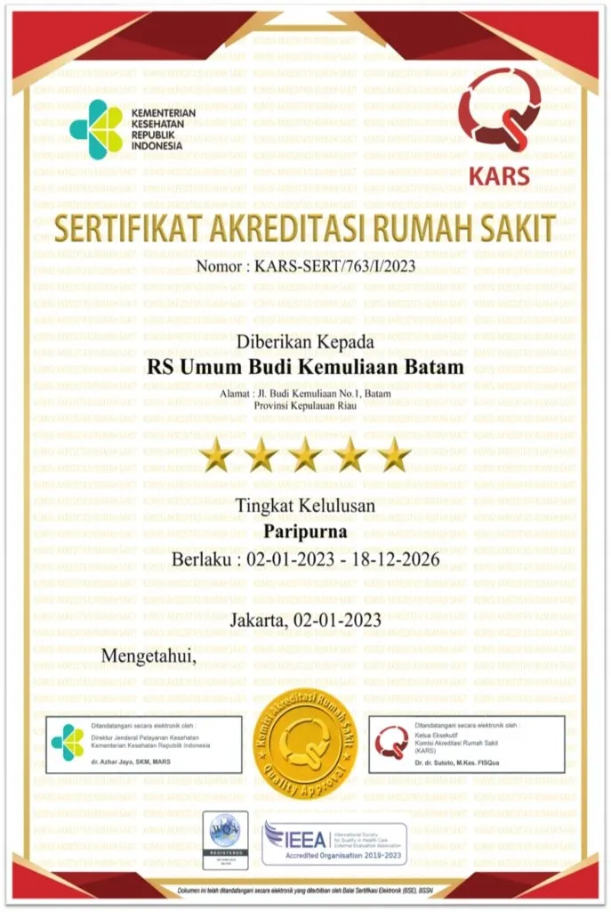 Pencapaian standar tertinggi dalam pelayanan rumah sakit di Indonesia. Predikat ‘Paripurna’ menjamin bahwa manajemen mutu dan keselamatan pasien di RSBK telah memenuhi standar ketat nasional.