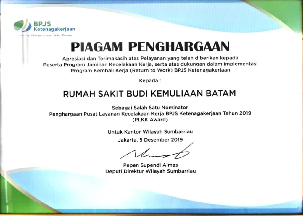 Menjadi salah satu nominator Penghargaan Pusat Layanan Kecelakaan Kerja BPJS Ketenagakerjaan pada tahun 2019